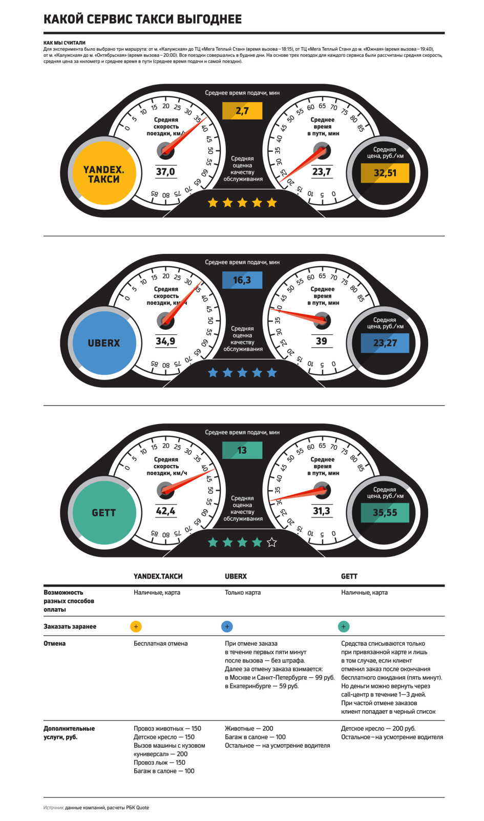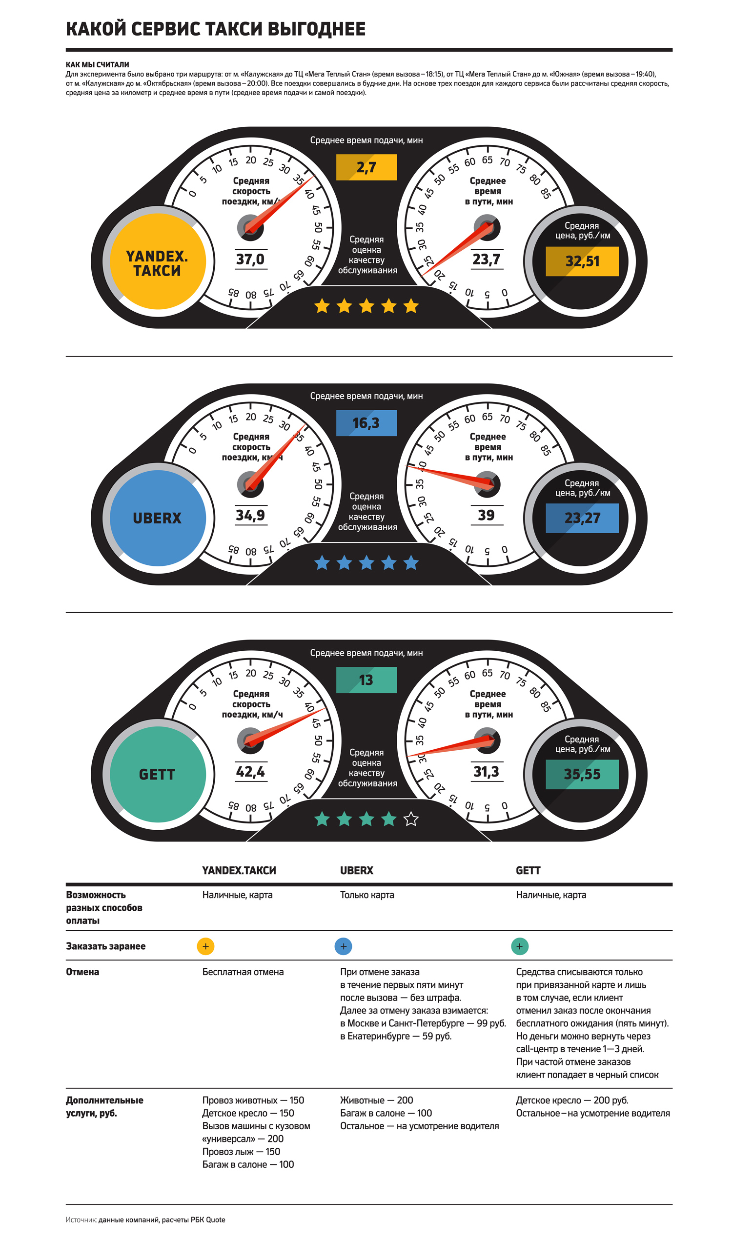 Для тестирования были выбраны самые дешевые тарифы у каждого из сервисов: «Эконом» у «Яндекс.Такси», «Комфорт» у Gett и UberX. По условиям эксперимента три сотрудника редакции РБК Quote одновременно вызывали такси с помощью одного из сервисов и ехали по одному и тому же маршруту. Всего с помощью каждого сервиса было совершено три поездки. Мы постарались выбрать маршруты с разной степенью сложности. Так, во время первой поездки необходимо было пересечь МКАД, выехав из Москвы. Во время второй поездки водителю нужно было пересечь МКАД, въехав в столицу. Еще одна поездка совершалась в пределах города. Время поездок было выбрано таким образом, чтобы попасть в час пик (с 18:00 до 20:00, по данным сервиса «Яндекс.Пробки») и, наоборот, проехаться по максимально свободным дорогам.